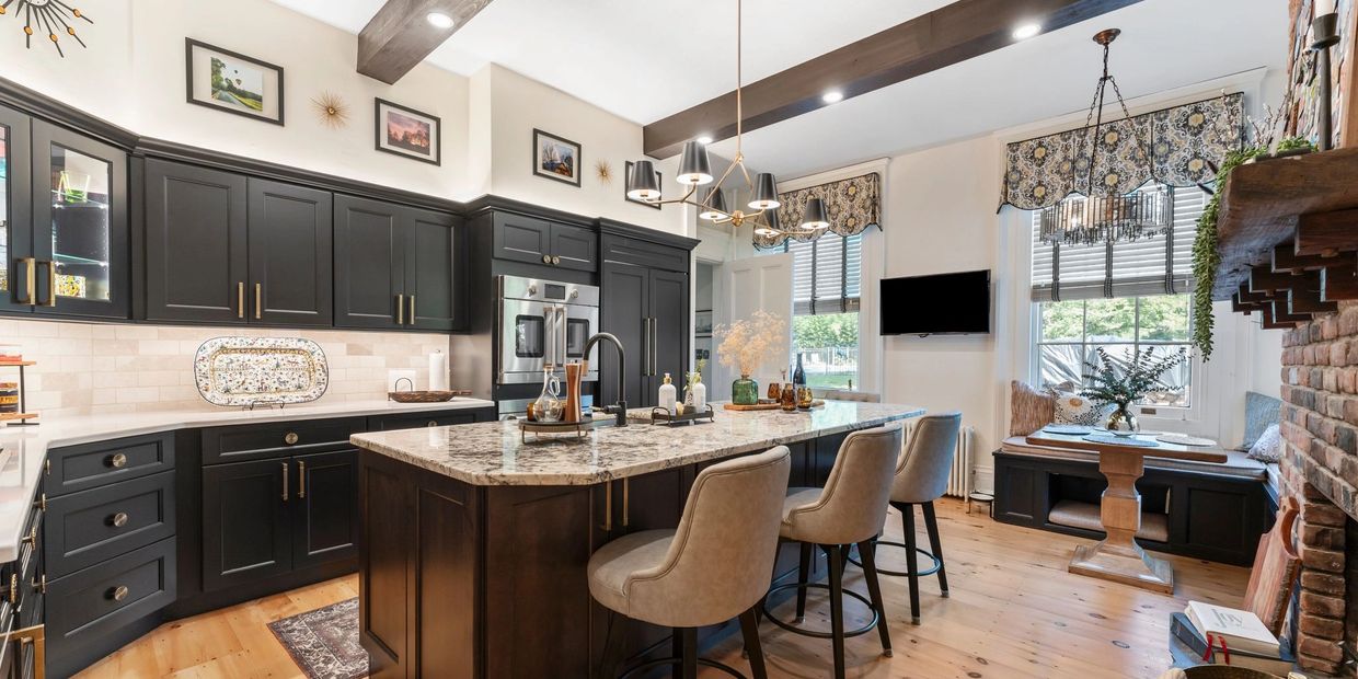 This 19th century historic home with a kitchen dating back to the 1970's was in dire need of a change. It is completely transformed with gorgeous Tricorn black kitchen cabinets, burnished brass hardware, built-in banquette, and custom beams with puck lighting to keep the kitchen light and bright.
