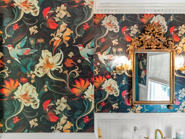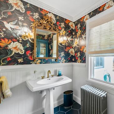 This antique mirror was discovered in our client's attic during our first design consult and became the inspiration for their powder room renovation. Playful and elegant, this bathroom brings the outside in with wallpaper that winks to the natural beauty right outside the window.