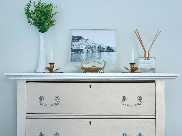 Set the mood in a bedroom with this salvaged dresser, styled with a beautiful image of the Italian beach that inspired the decor of this bedroom. Paired with essential oil that winks to the summer breeze, our sensory design approach sparks wonderful memories and the telling of epic stories.